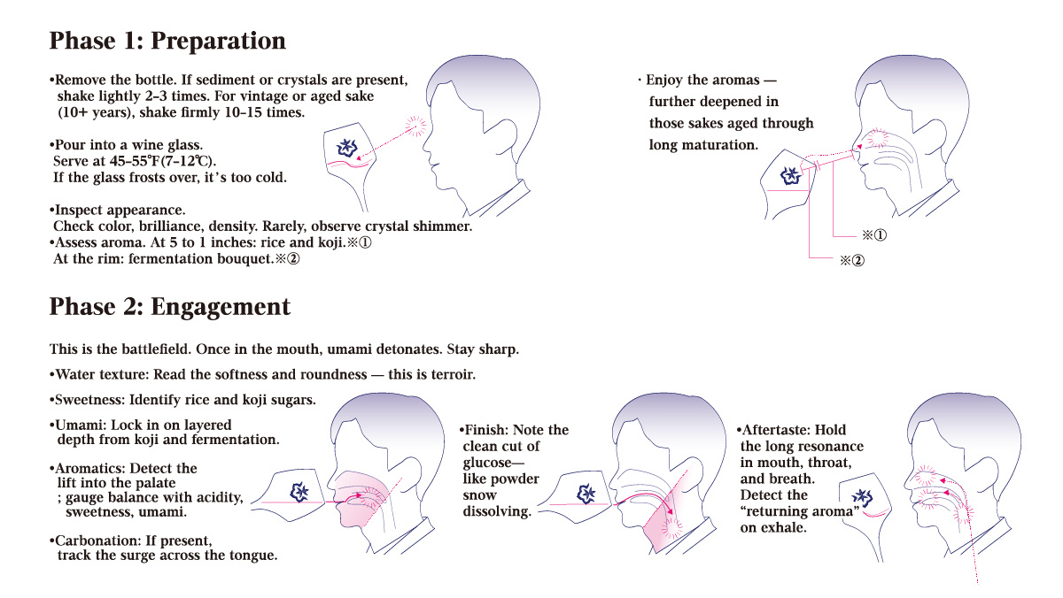 By contrast, SAMURAI style Sake is built upon umami itself. Koji breaks down rice proteins into amino acids, yielding up to ten times the umami of wine. The moment it enters the mouth, umami floods the tongue while aromas rise simultaneously into the nose — flavor and fragrance surge in parallel, resonating, layering, and echoing long after the sip.